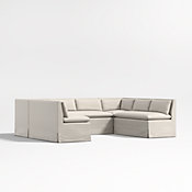 Made for lingering, our Belmar modular seating takes a breezy approach to mealtime. Pitched back to relax the back, the corner and two bench banquettes layer on comfort with pillow backs and seat cushions. The linen-like performance fabric that handles the occasional spill, and slipcovers keep the look neat with a snug fit and inverted pleats for a bit of understated tailoring. The three-piece, L-shaped dining banquette provides a flexible approach to kitchen or dining room seating.