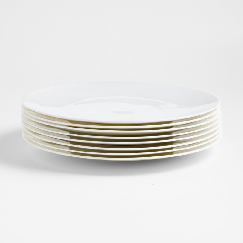 The pristine translucence and timeless quality of fine white bone china, reinterpreted for the modern table. Part of our Bennett collection of square, round and oval dinnerware that dresses up or down, these eight coupe-shaped dinner plates have an ethereal presence on the dining table (while secretly being ultra-durable). The lightweight set resists chips and scratches then cleans up in the dishwasher for worry-free dining and entertaining. Add our other exquisite hand-finished Bennett dishes to set a fresh table.