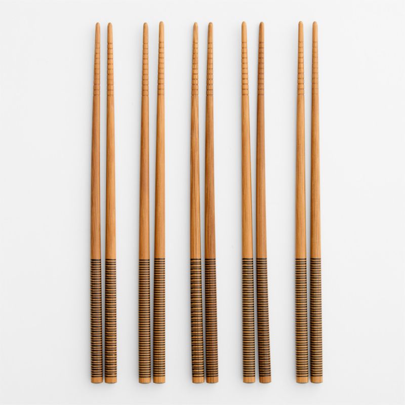 Narrow black stripes add a decorative touch to this set of five chopstick pairs made of sustainably sourced bamboo. Grooved detailing at the tips makes it easy to grasp food. We especially like the chopsticks paired with our black ceramic or organically shaped dinnerware.