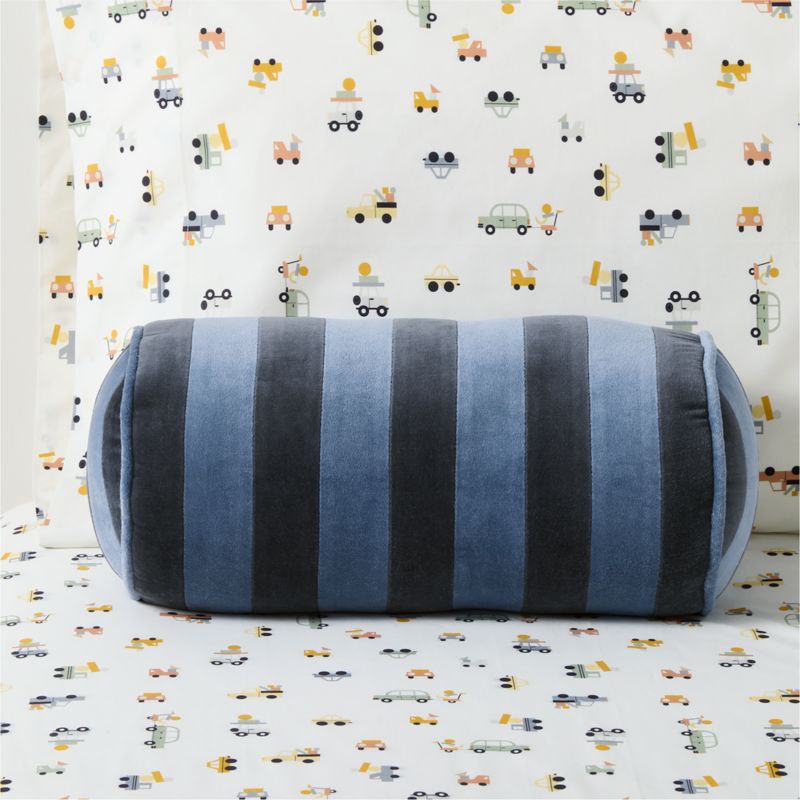 Add a pop of playful color to the kid's room with a delightfully plush bolster pillow covered in soft cotton velvet. Our Harriet pillow features bold navy and cobalt blue stripes trimmed with dainty coordinating piping. It makes a cheerful accent for a bed or a chair, or use it as a snuggly pillow during storytime.