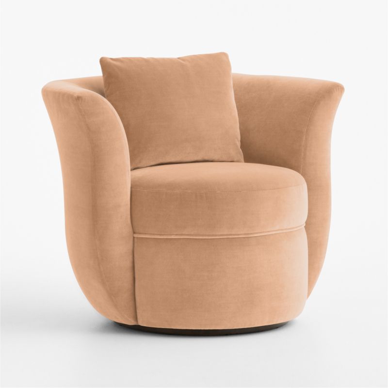 We looked to vintage Art Deco design in developing Blume's dramatic tulip shape. The accent chair's barrel back flares petal-like curves that embrace the loose back and round seat cushions. Petite in scale with a taller seat, the chair offers a comfortable sit with medium-firm support and swivels in the round for maximum versatility. An exceptionally durable velvet tailors Blume with rich color and a sumptuous hand.
