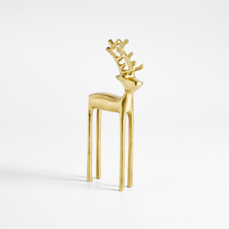 Crafted by hand with flowing curves and a modern, abstracted silhouette, our reindeer sculpture gazes across the winter landscape. The tall caribou's elongated legs and endearing personality add a playful element to holiday decor, while the gleaming brass finish brings a touch of glam. Group with our other exclusive reindeer sculptures to create a miniature holiday herd on your fireplace mantel, buffet or dining room table—we especially love the way the gilded deer reflect the sparkle of Christmas lights.