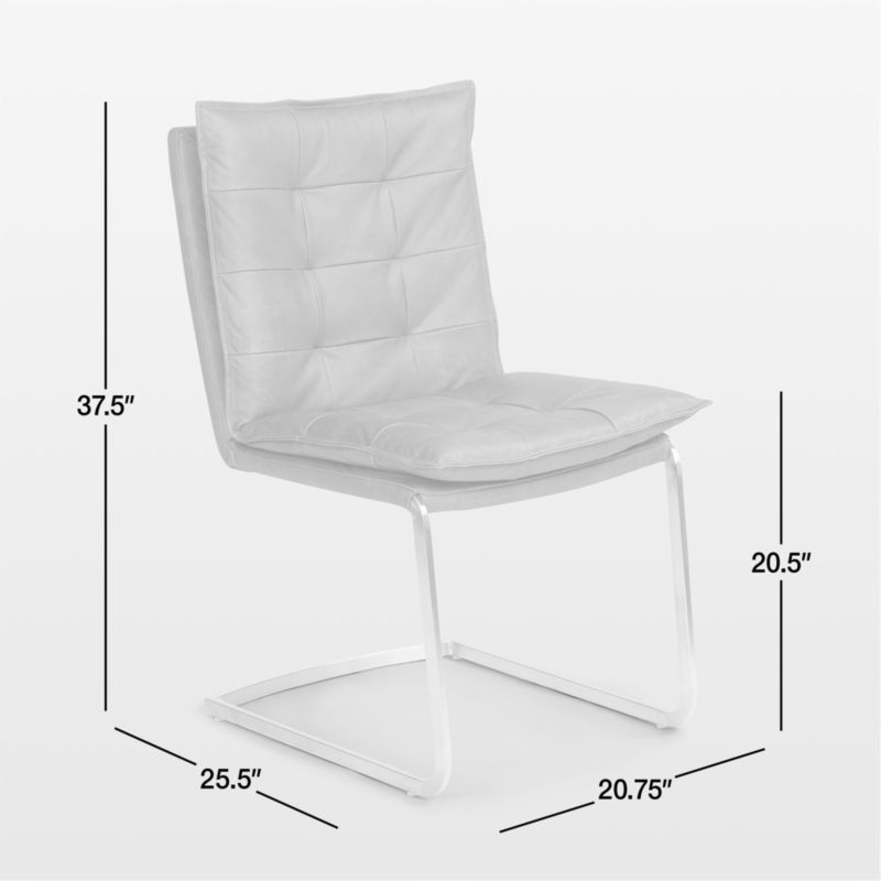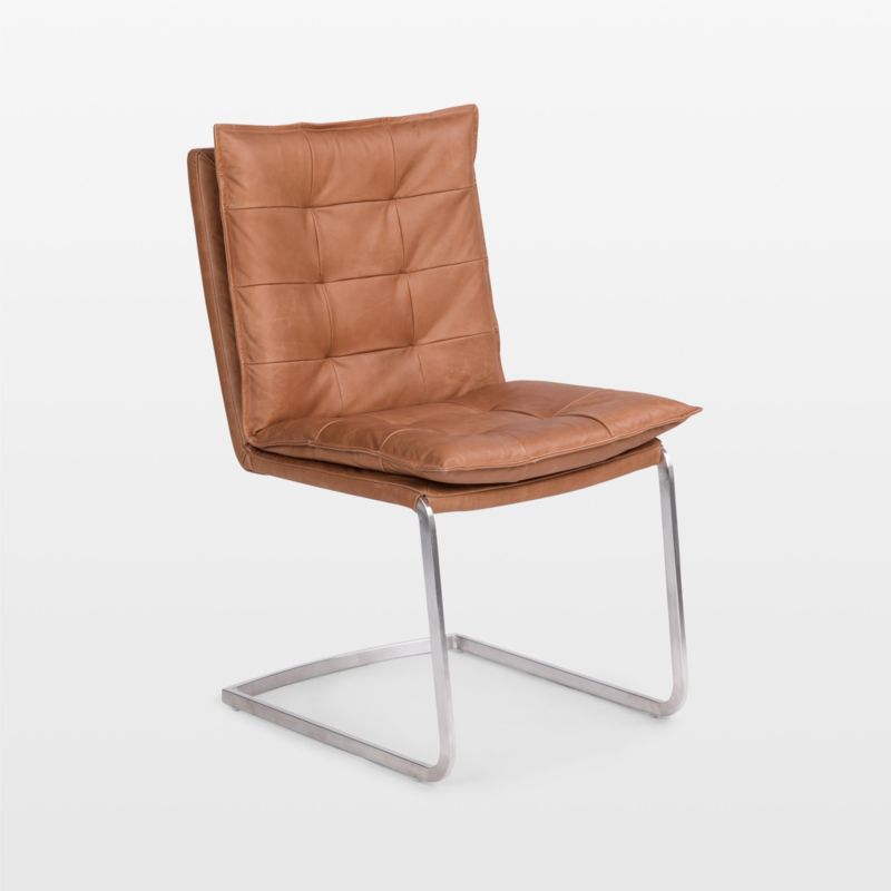 Our Cahone dining chair is slim in stature, high in style. A tubular base of stainless steel cantilevers an airy frame that floats the brown leather-upholstered seat. Blind-tufted seat and back cushions sit pillow-like on a tight base for a modern update on the classic, clubby look of a leather armchair.