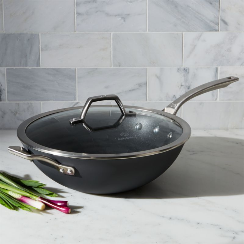 Traditionally shaped with high, sloped sides, this cooking wok has a flat bottom for easy stir-frying on modern stovetops. Its nonstick surface evenly sears, browns, sautés and seals in juices when cooking meats, seafood and vegetables. Crafted from heavy-gauge, hard-anodized aluminum, it's so durable that you can cook with metal spatulas, spoons and whisks, and it's dishwasher safe. Long, brushed stainless steel handle stays cool for stovetop cooking, while tempered-glass lid allows you to check on cooking progress.