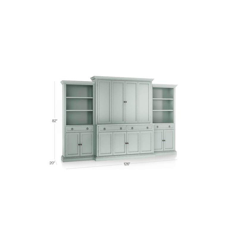 The TV stand with double bi-fold doors and two storage drawers supports the media/TV hutch with crown molding, adding drama and height to media configurations and hiding the TV when not in use. The two-shelf storage bookcases with enclosed cabinets and drawers stand alone or surround the main media pieces for a custom built-in effect, with the hutch elevated above the cases. The Cameo Blue Grey 4-Piece Entertainment Center with Storage Bookcase