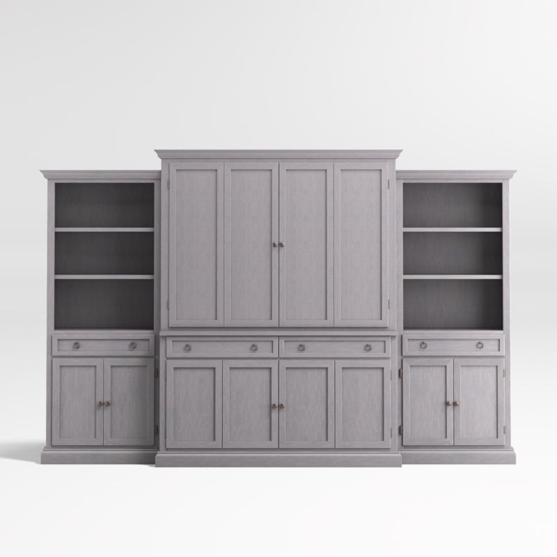 This versatile modular furniture collection makes an extended cameo appearance in the living room, family room or den, configuring beautifully for customized storage, media display and exhibiting prized possessions. Each entertainment center undergoes a multi-step process of painting and distressing hand-applied by Italian artisans to create its dove grey finish. The TV stand with double bi-fold doors and two storage drawers supports the media/TV hutch with crown molding, adding drama and height to media configurations and hiding the TV when not in use. The two-shelf storage bookcases with enclosed cabinets and drawers stand alone or surround the main media pieces for a custom built-in effect, with the hutch elevated above the cases. The Cameo Dove Grey 4-Piece Entertainment Center with Storage Bookcase is a Crate and Barrel exclusive.