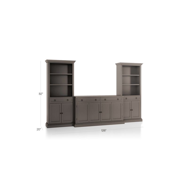 The two-shelf storage bookcases with enclosed cabinets and drawers stand alone or surround the main media pieces for a custom built-in effect, with the hutch elevated above the cases. The Cameo Grigio 3-Piece Entertainment Center with Storage Bookcases is a Crate & Barrel exclusive.
