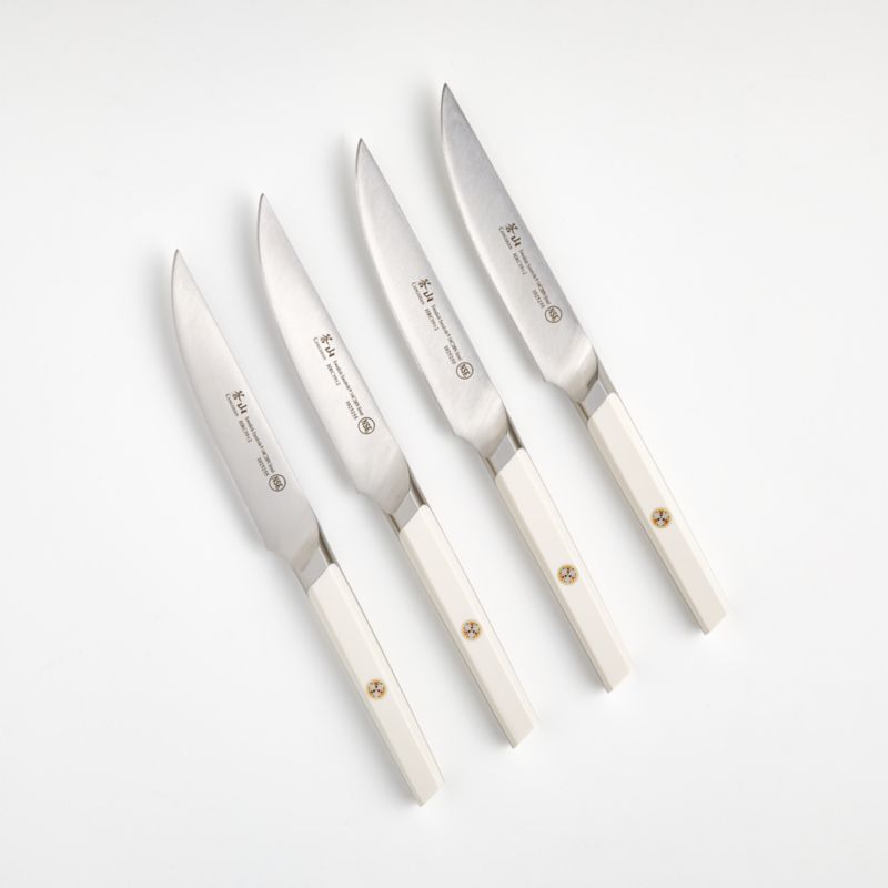 High-alloy Swedish steel takes and holds a precise edge for a set of steak knives that maintain their impressive sharpness even with daily use. The forged, full-tang blades go through a six-stage heat treatment that creates stable structure, consistent hardness and exceptional sharpness. Designed for everyday dining, the four knives offer comfortable, ergonomic handles in white finished with a delicately beautiful single mosaic rivet for an elegant look. The International Red Dot design award-winning set makes a lovely host, housewarming or wedding gift.