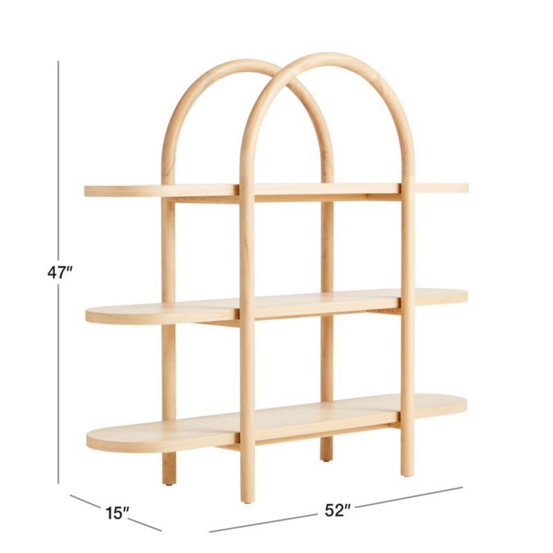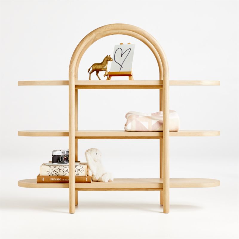Striking a balance between playful and design-forward, this airy bookcase provides plenty of space for prized possessions and beloved books. Round solid white oak posts curve into wide arches that support three pill-shaped shelves. The shelves extend well past the trellis-like structure, creating an exaggerated, whimsical look. Designed by Leanne Ford, our Canyon Natural Wide Bookcase adds storage space and cool factor to the nursery or kids' room.