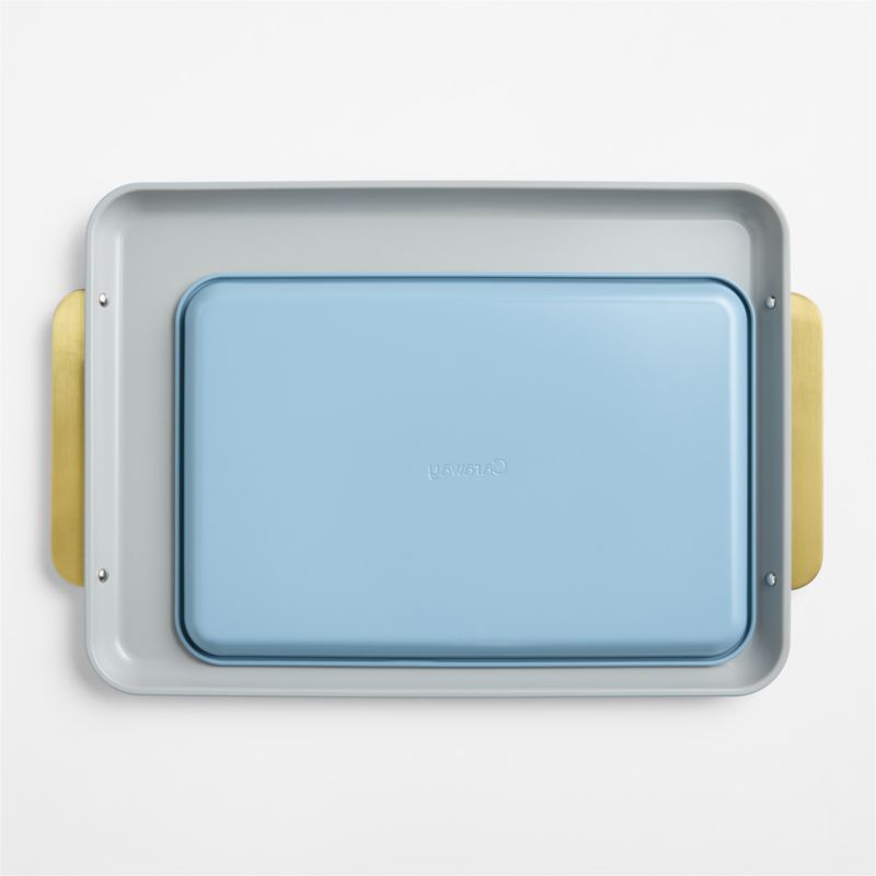 Bake an entree and a side or dinner and dessert on this pair of baking sheets. Finished in a naturally non-stick ceramic coating, the aluminized steel pans release baked goods easily for quick cleanup. Lagoon-inspired blue exteriors and golden handles give the duo a fresh, modern look. A useful housewarming or engagement gift—or an anytime present for your favorite baker—this set includes medium and large baking sheet pans.