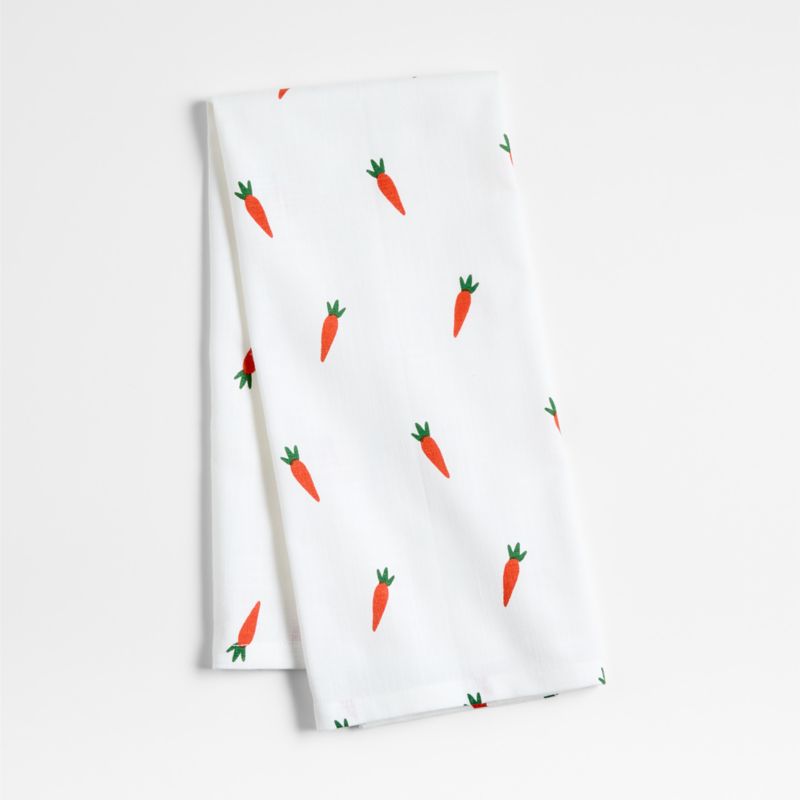 A bushel's worth of carrots scatter our dish towel with vibrant fresh-from-the-garden color. Printed in orange and green, the bright white organic cotton dries dishes, counters and hands—and gets even softer with every washing. Perfect for lining a bread basket for a spring feast, the towel also wraps a bottle of bubbly or loaf of carrot cake as a sweet gift for the Easter host.
