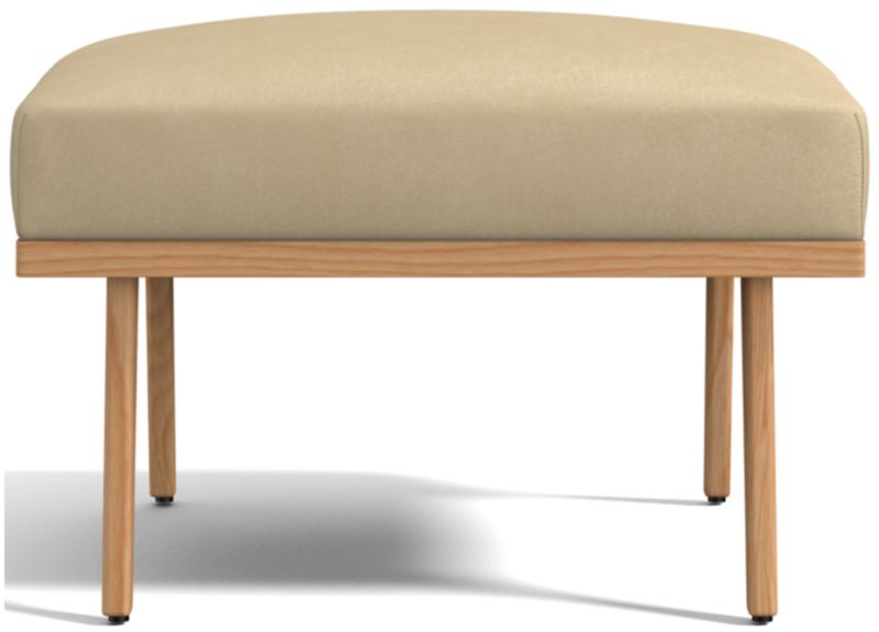 Relax back to another modern time. Cavett's mid-century lines capture the best of 1950s design with this ottoman of solid ash and rich leather. Dramatic design attracts the eye from every angle. A sleek choice for smaller living rooms and family rooms, the leather ottoman upholstered in luxe full-grain, full-aniline leather adds comfort when paired with Cavett Leather Chair. Each leather ottoman is distinguished by the unique characteristics of its beautiful hides, finished with oils and wax for an authentic look that will develop an even richer patina over time. Cavett Leather Ottoman is a Crate & Barrel exclusive.
