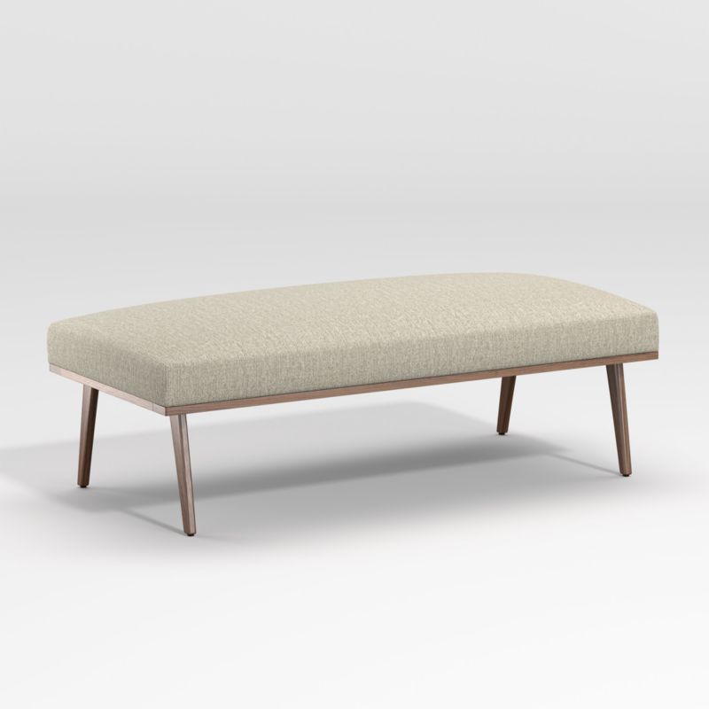Sleek, slender legs and a basketweave cushion in varied tones of brown make the Cavett bench a welcome presence in any room. The Cavett Bench is a Crate and Barrel exclusive.
