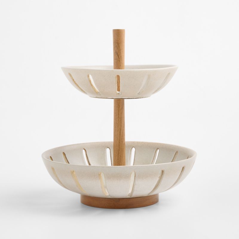 Elevate your farmers market finds, garden veg and grocery store produce with this artisanal fruit basket. Skilled artisans press clay into a mold, creating the large and small ceramic bowls with elegant cutouts that allow airflow to help keep contents fresh. Finished with a reactive white glaze that reveals glimpses of the earthy clay below, the perfectly imperfect bowls stack on an acacia wood base. Our tiered produce basket has a warm, organic presence on your countertop, kitchen table or buffet.