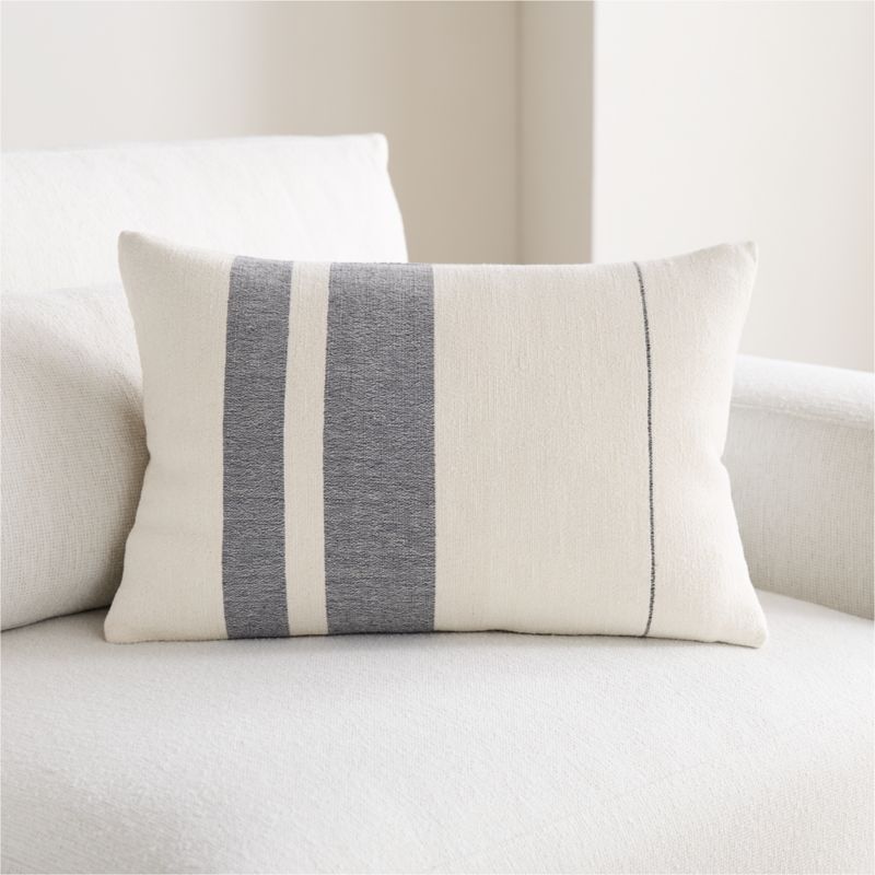 Charlie takes a relaxed approach to colorblocking with muted colors and graphic minimalism. Made of organic cotton, the subtly textured pillow juxtaposes a pencil-thin black stripe with two thick stripes in soft shades of green, blue, sand or gold on an ivory ground. Our exclusive lumbar pillow includes your choice of a plush feather-down or lofty down-alternative insert.