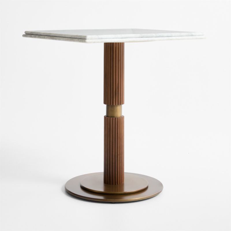 Exquisite materials and dimensional detailing accentuate the modern simplicity of our Chelsea dining table. A double bullnose edge puts the focus on the gorgeous veining of the square Carrara marble top. Set on a circular stepped base, the columnar pedestal is made of natural-finished walnut with vertical ribbing and an inset collar of burnished brass. The perfect bistro table, Chelsea seats two.
