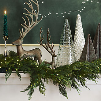From the living room mantelpiece to wall shelves in the bathroom, Christmas candles add a bright and festive touch to spots throughout the home. Not sure which design is the best fit for your space? Consider different types of Christmas candle decorations to find a variety that suits your style and needs. Tall Christmas candlesticks, for example, have a refined look that makes them ideal for the dining table. What's more: these taper candlesticks are either black, white or red, which pairs seamlessly with your choice of neutral or holiday-inspired candle holders. Or, for another candle centerpiece idea, scatter miniature tea lights around two or three white candles to decorate your tabletop with festive lighting. If there are children at the table, flameless candles are a safe and convenient alternative. Whether you opt for Christmas candlesticks, flameless designs or beyond, Christmas candle centerpieces provide mealtime with a warm and intimate glow. Looking to bring Christmas candlelight to other parts of the home this December? Try placing pillar candles on a fireplace mantelpiece, floating bathroom shelf, bedside table or beyond. If you have an outdoor space, stylize some in hurricanes as a cozy Christmas porch idea. Christmas taper candles, meanwhile, look as natural on side tables as they do in the dining room. When looking to get especially festive, Christmas candle lights in holiday-specific shapes capture the spirit of the season. Pine tree candles, for instance, are an ideal complement to your faux Christmas tree and pair seamlessly with the natural feel of your Christmas taper candles. Looking for more holiday gift ideas? Explore our Christmas store to discover ornaments, Christmas stockings and other holiday goodies.
