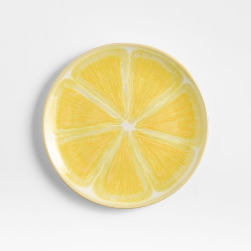 Our lemony-fresh salad plate brightens summertime entertaining. The subtle coupe shape puts the focus on the citrus decoration, painted and glazed by hand in vivid yellow to resemble a juicy cross section of a freshly cut lemon.