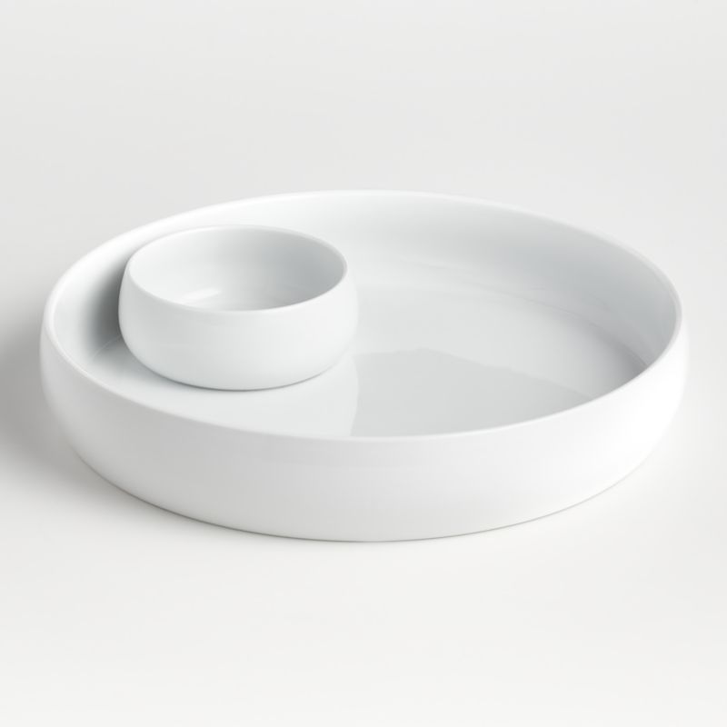 An exclusive Crate and Barrel design by ceramicist Bret Bortner, the clean curves of this truly classic white chip and dip set are the essence of simplicity for presenting dips, salsas or hummus with chips, crackers, shrimp or veggies. The double bowl design adds ultimate versatility and easy clean-up.