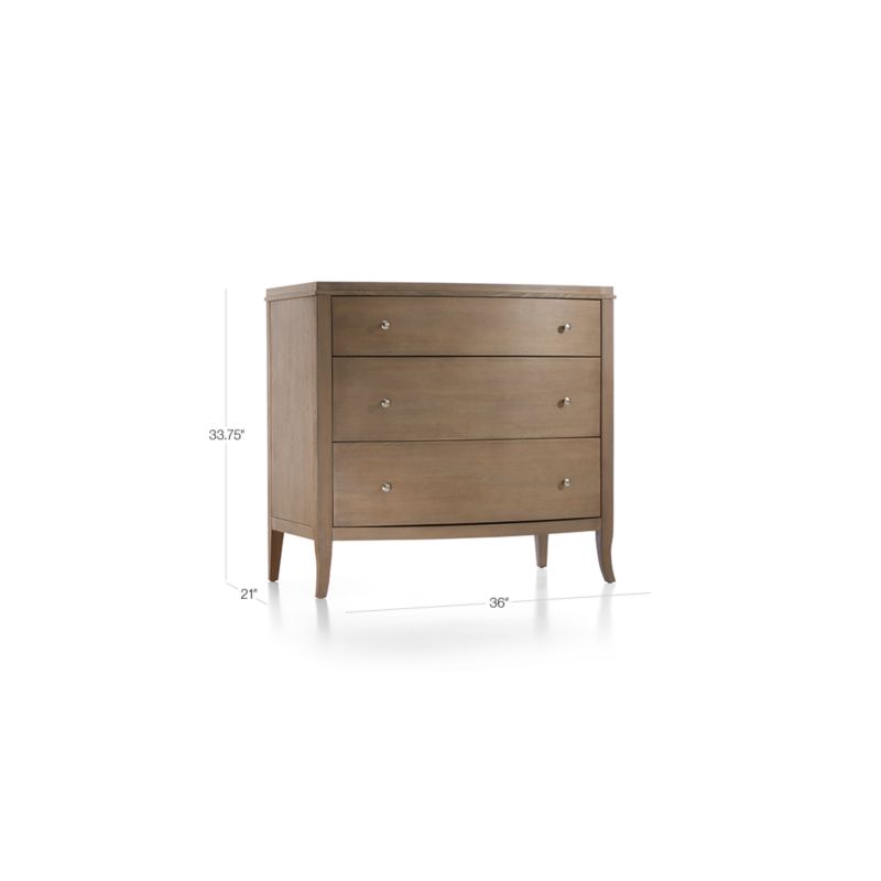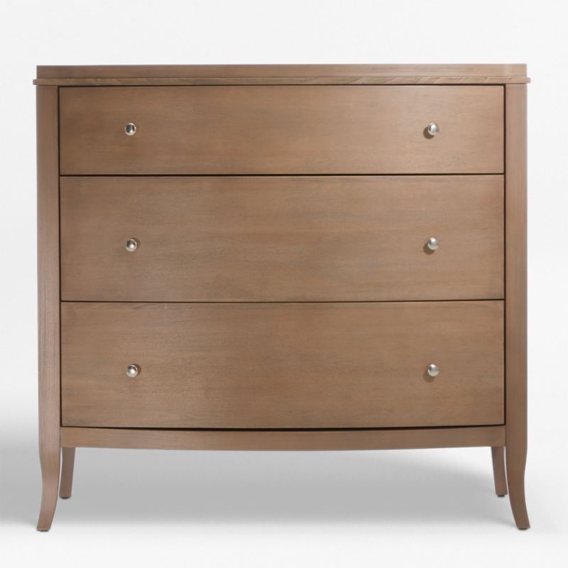 Evoking the elegance of 1940s-era design, the Colette three-drawer chest graces the bedroom with a curved bow front and saber legs in a restful grey-brown stain. Trim molding and classic domed knobs in brushed pewter add extra polish.