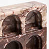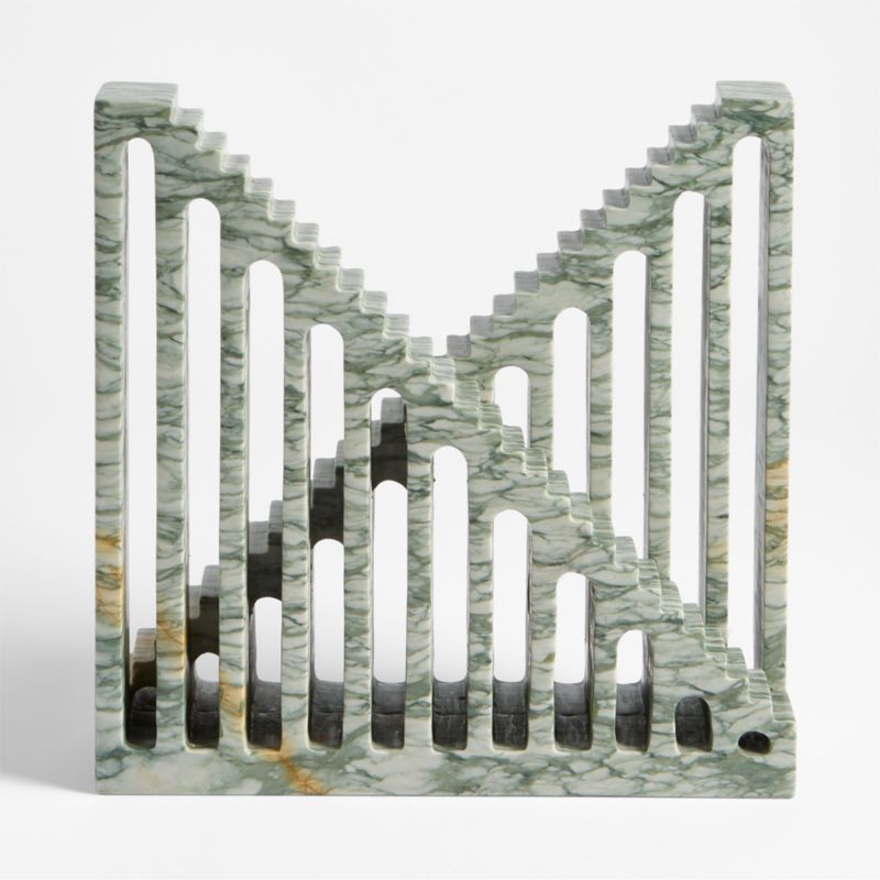 Inspired by fantastical spaces and stories, our stairways to nowhere encourage flights of fancy. This green marble sculpture pairs two opposing staircases, each supported by an airy colonnade. Hand-carved by skilled artisans, the piece reminds us of rollercoasters, escalators or ancient Greek temples.This sculpture has a classical-yet-surreal presence on a bookshelf or mantel, especially paired with our other marble stairways.
