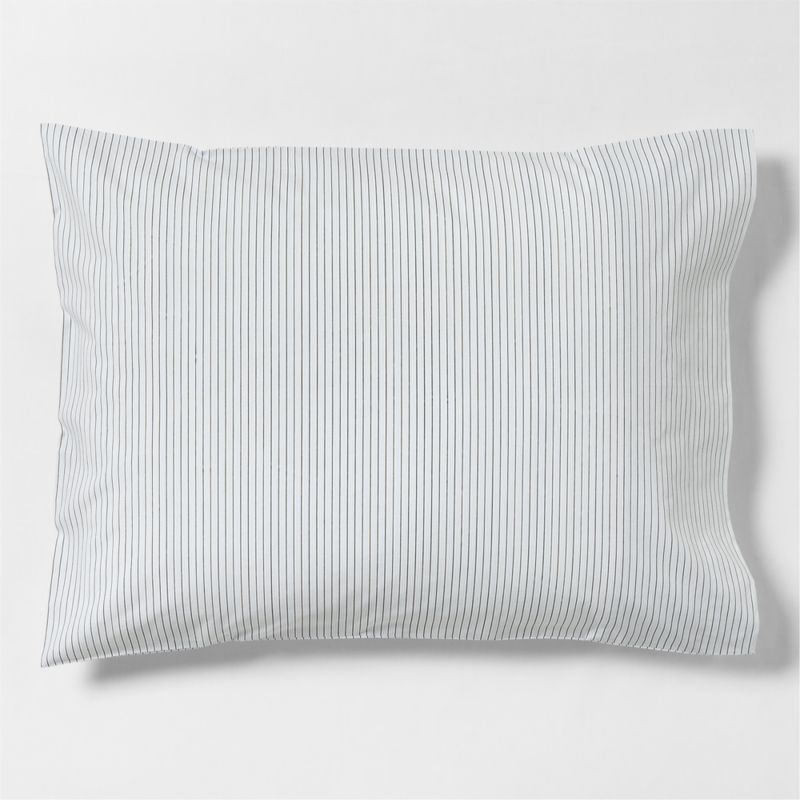 Our CozyCloud bedding collection makes a dreamy dorm room bed. This organic cotton pillow sham in a breathable percale weave sleeps cool, while the supersoft washed finish keeps things cozy. The look is a fresh and casual take on a classic, with sky blue and midnight navy pinstripes on crisp white. We love this sham mixed and matched with our other solid and patterned bedding in the same tonal palette.