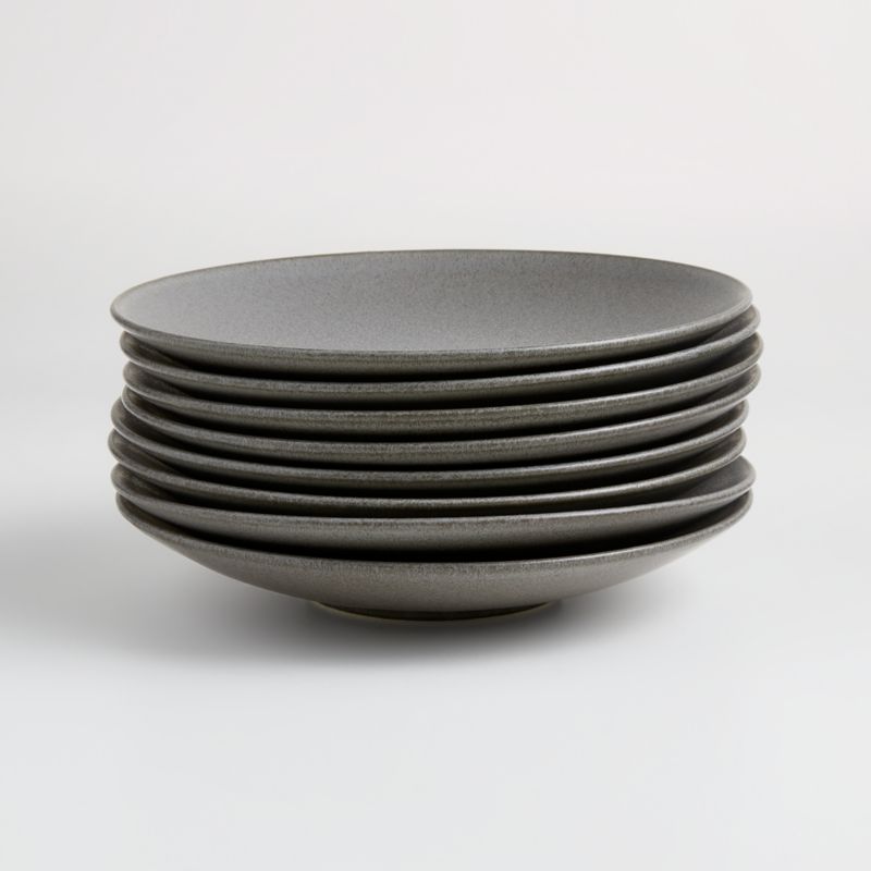 A study in delicious contradictions, our Craft salad plates are strong and durable yet light and refined—and their warm minimalism suits everyday use and elegant occasions. A lightly speckled glaze in charcoal coats the plates' clean coupe shape, subtly accented with darker rims. The set of eight charcoal grey salad plates sets a modern table accompanied by the other pieces in our exclusive Craft dinnerware and table linens collection.