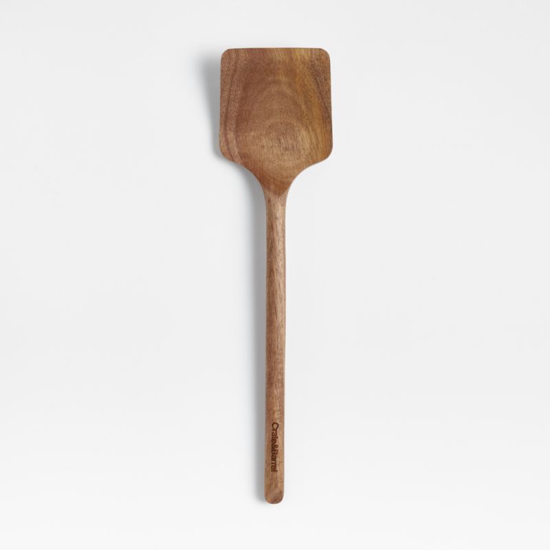 Flip, scoop and serve eggs, pancakes and lasagna with our signature acacia solid turner. Sustainable acacia wood shapes a modern organic tool with a warm, classic look and a cylindrical handle for a sturdy grip. We love the way the refined beveled edge finishes the elongated handle with a dynamic detail. Combine the solid turner with the other exquisitely proportioned utensils in our exclusive Crate & Barrel collection for a well-outfitted workspace that's up to any cooking challenge.