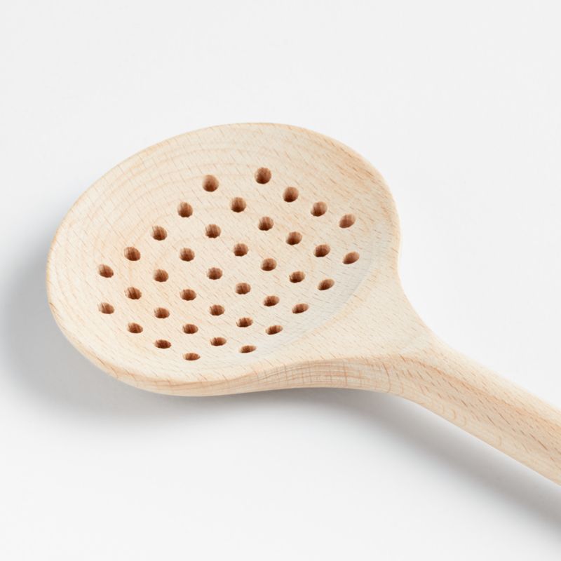 Stir, scoop and serve dumplings, pasta and peas with our signature beechwood slotted spoon. The essential utensil ably handles boiled potatoes and pot roast, while the grid of perforations allows liquids to drain away. Sustainable beech shapes a modern organic tool with a warm, classic look and a cylindrical handle for a sturdy grip. We love the way the refined beveled edge finishes the elongated handle with a dynamic detail. Combine the slotted spoon with the other exquisitely proportioned utensils in our exclusive Crate & Barrel collection for a well-outfitted workspace that's up to any cooking challenge.
