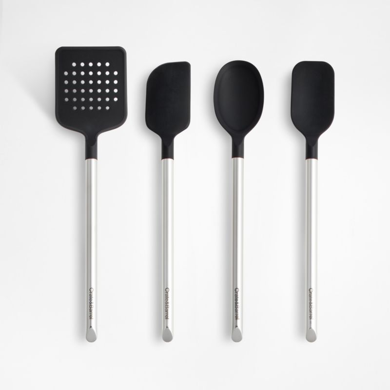 Stir, scoop, serve, scrape, flip and mix with four of our signature black silicone and stainless steel utensils. Constructed with nylon cores for strength, the black silicone heads ably spread the thickest batters, flip the juiciest burgers and fold the most delicate meringues. Their flexible, tapered edges scrape bowls, blenders and pans, while soft-touch silicone won't damage non-stick cookware and resists stains, scratches and heat up to 600 degrees. Polished stainless steel shapes sleek cylindrical handles for a sturdy grip and a professional look. We love the way the refined beveled edges finish the elongated handles with a dynamic detail. Our exclusive Crate & Barrel spatula, spoon, spoonula and slotted turner make for a well-outfitted workspace that's up to any cooking challenge.