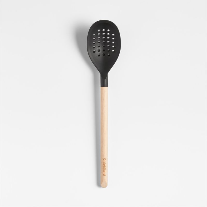 Stir, scoop and serve dumplings, pasta and peas with our signature black silicone and wood deep slotted spoon. Constructed with a nylon core for strength, the double-capacity spoon is generously sized to scoop and serve with perforations that allow liquids to drain away. Soft-touch silicone won't damage non-stick pans and resists stains, scratches and heat up to 600 degrees. Natural beechwood shapes a sleek cylindrical handle for a sturdy grip and a warm, classic look, and a refined beveled edge finishes the handle with dynamic detail. Combine the black deep slotted spoon with the other exquisitely proportioned utensils in our exclusive Crate & Barrel collection for a well-outfitted workspace that's up to any cooking challenge.
