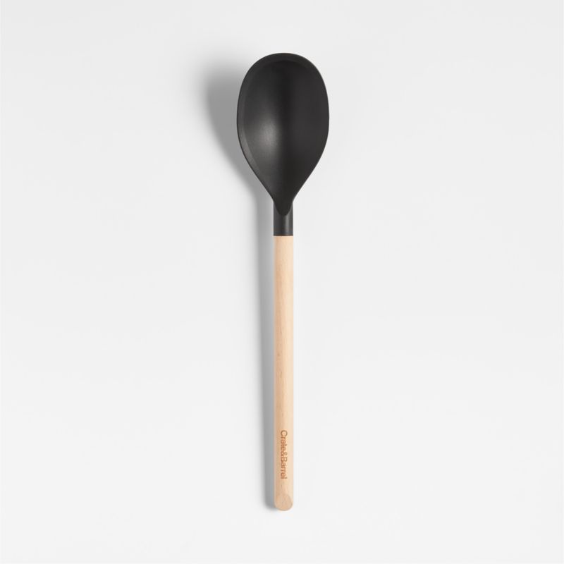 Stir, scoop and serve with our signature black silicone and wood deep spoon. Constructed with a nylon core for strength, the double-capacity spoon is generously sized to scoop and serve. Soft-touch silicone won't damage non-stick cookware and resists stains, scratches and heat up to 600 degrees. Natural beechwood shapes a cylindrical handle for a sturdy grip and a warm, classic look. We love the way the refined beveled edge finishes the elongated handle with a dynamic detail. Combine the black deep spoon with the other exquisitely proportioned utensils in our exclusive Crate & Barrel collection for a well-outfitted workspace that's up to any cooking challenge.