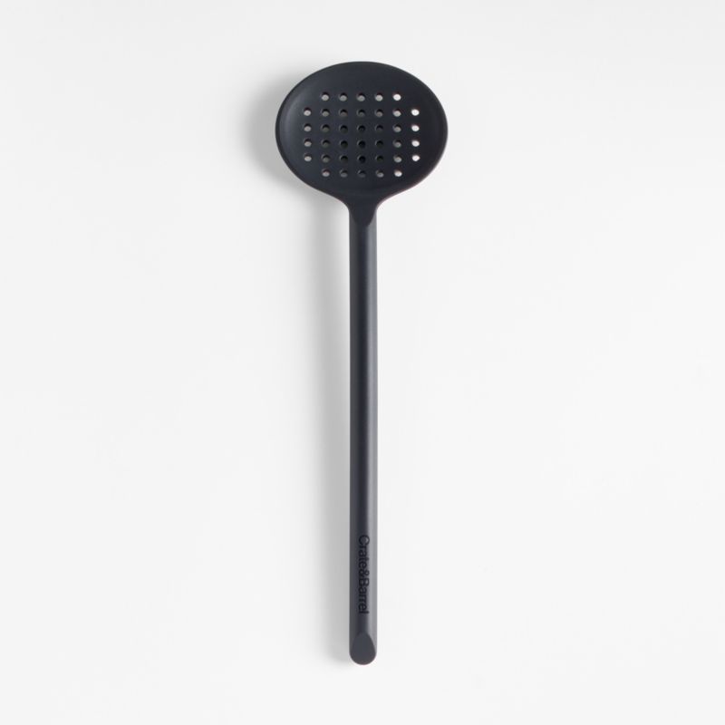 Stir, scoop and serve dumplings, pasta and peas with our signature black silicone slotted spoon. Constructed with a nylon core for strength, the black silicone utensil ably handles boiled potatoes and pot roast, while the grid of perforations allows liquids to drain away. Soft-touch silicone won't damage non-stick pans and resists stains, scratches and heat up to 600 degrees. We love the way the refined beveled edge finishes the elongated handle with a dynamic detail. Combine the dishwasher-safe slotted spoon with the other exquisitely proportioned utensils in our exclusive Crate & Barrel collection for a well-outfitted workspace that's up to any cooking challenge.