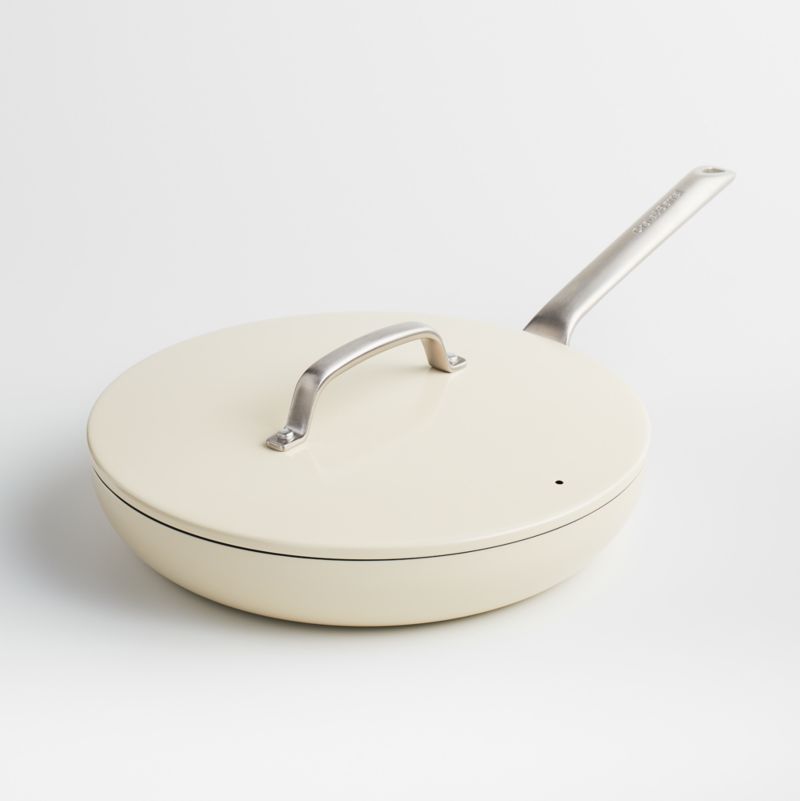 Our exclusive cookware collection has been scrutinized at every stage to bring you the heirloom quality and refined look your kitchen deserves. Made of specially treated EvenCook Ceramic™ hard-anodized aluminum, the cream-colored skillet provides even heat control for superior performance. Ideal for browning and searing with less oil, the non-stick cooking surface has a diamond-infused ceramic coating that effortlessly releases foods and cleans up easily. The ergonomically considered handle stamped with the Crate & Barrel logo feels comfortable and balanced and is secured with smooth-profile rivets for easy cleaning. Ideal for browning and searing, the lidded frying pan is also oven- and broiler-safe to 500°F.
