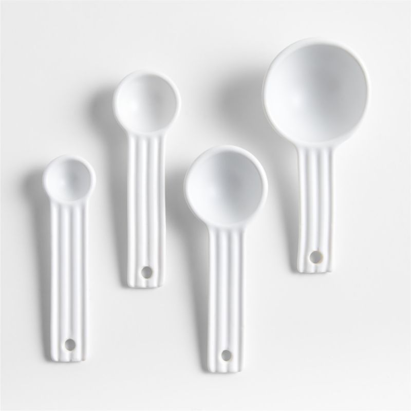 Inspired by the ceramic pieces in our Hanno collection, this measuring spoon set exhibits the same fresh white finish and dynamic ribbing. The durable porcelain spoons are textured on their handles for a fresh linear look. Created by the wax-resist process, dimensional metric and imperial measurement markings under each handle will not fade in the dishwasher. Combine this modern set with the rest of the Hanno collection for coordinated cooking, baking and dining.