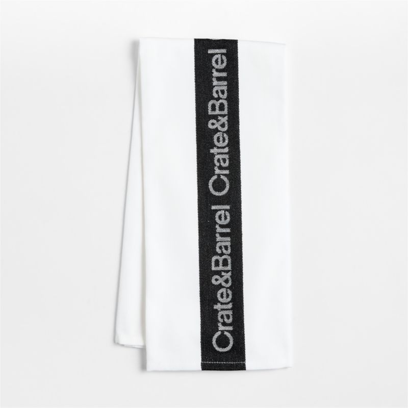 Our iconic logo stripes this dish towel for a bistro look. Jacquard woven in crisp black-and-white, the central band repeats "Crate & Barrel" in a graphic motif. We love using this organic cotton dish towel as reusable wrapping paper or as a substitute for tissue paper in one of our classic gift bags.