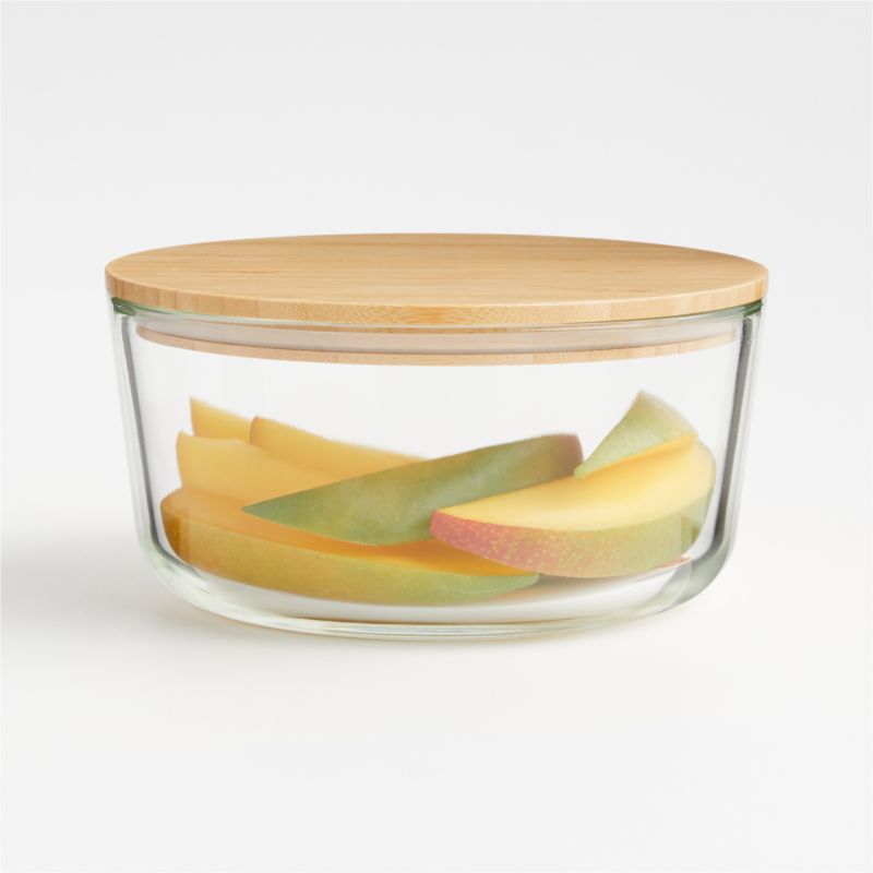 Beautify and organize leftovers, snacks and essential ingredients in our bamboo-topped glass storage container. Fitted with a silicone gasket, the durable borosilicate glass container closes securely with an airtight seal. The golden bamboo contrasts with the clear glass below for a modern organic look in the refrigerator, in a cabinet or on your desk. With a seven-cup capacity, the round storage container can be used to heat up lunches and leftovers in the microwave or oven and cleans up easily in the dishwasher.