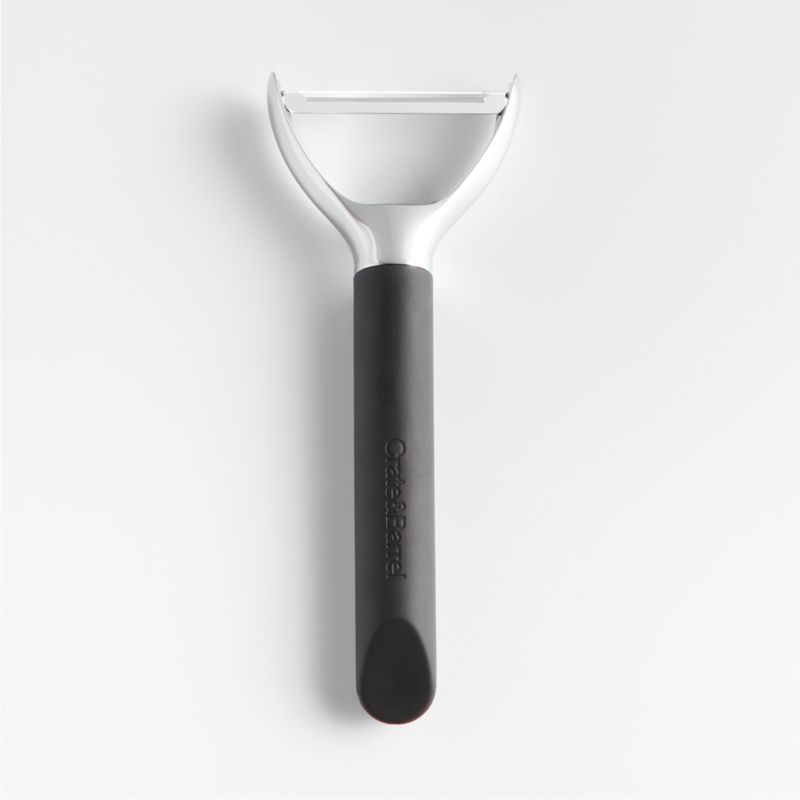 Peel potatoes, apples and butternut squash with ease using our signature Y peeler. Crafted with an angled blade, the dishwasher-safe tool glides smoothly over fruits and vegetables. Stainless steel and die-cast zinc shape a sleek utensil fitted with a black soft-touch handle for a sturdy, comfortable grip. We love the way the refined beveled edge finishes the handle with a dynamic detail. Our exclusive Crate & Barrel soft-touch tools make for a well-outfitted workspace that's up to any cooking challenge.
