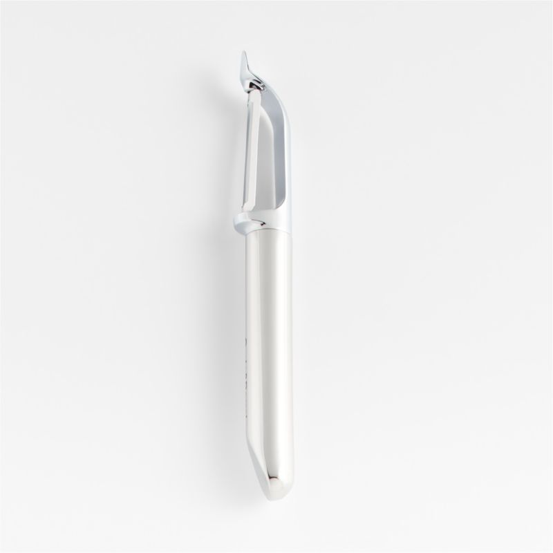 Peel potatoes, cucumbers and butternut squash with ease using our signature peeler. Crafted with a swivel blade, the dishwasher-safe tool glides smoothly over fruits and vegetables, allowing you to peel in both directions. Stainless steel and die-cast zinc shapes the sleek tool accented with a refined beveled edge that finishes the handle with dynamic detail. Our exclusive Crate & Barrel soft-touch tools make for a well-outfitted workspace that's up to any cooking challenge.