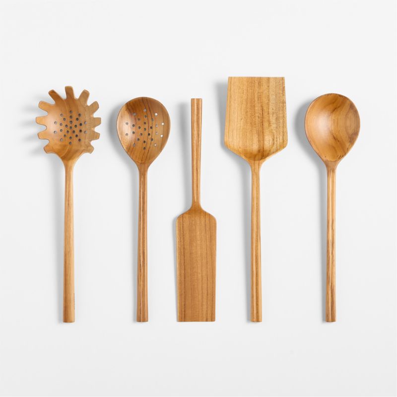 Flip, stir, scoop and serve with our signature teak utensils. Showing off its lovely grain, sustainably sourced teak shapes modern organic tools with a stunning look and unique handle design. The tapered handles each shape a figure eight, adding a sculptural element we love. Collect all of the exquisitely proportioned teak utensils in our exclusive Crate & Barrel collection for a well-outfitted workspace that's up to any cooking challenge.