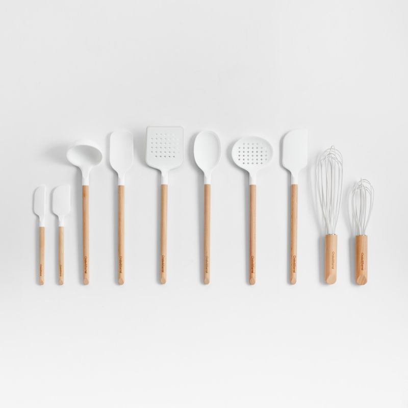 Crate & Barrel Wood and White Silicone Utensils, Set of 10