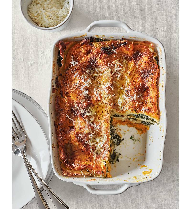 - Spread the remaining spinach filling over the noodles and then top with the final layer of cooked noodles. Spread the remaining squash filling over the top, and finish with the remaining mozzarella, fontina and Parmesan cheeses.
