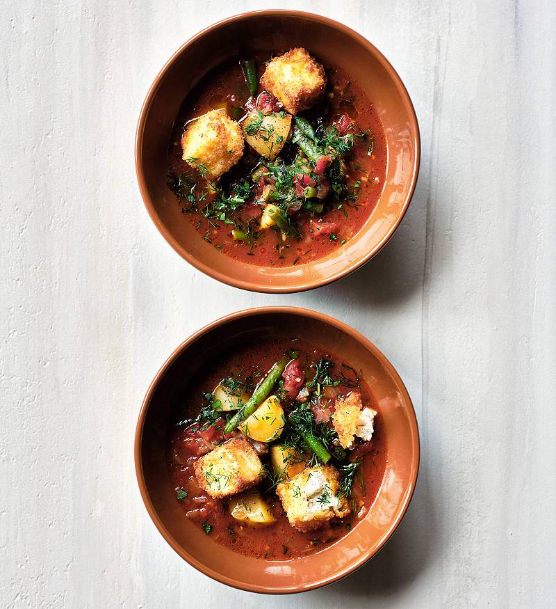 - Divide the soup between four bowls and top each with fried feta. Sprinkle with flaky salt, additional pepper and dill if desired.
