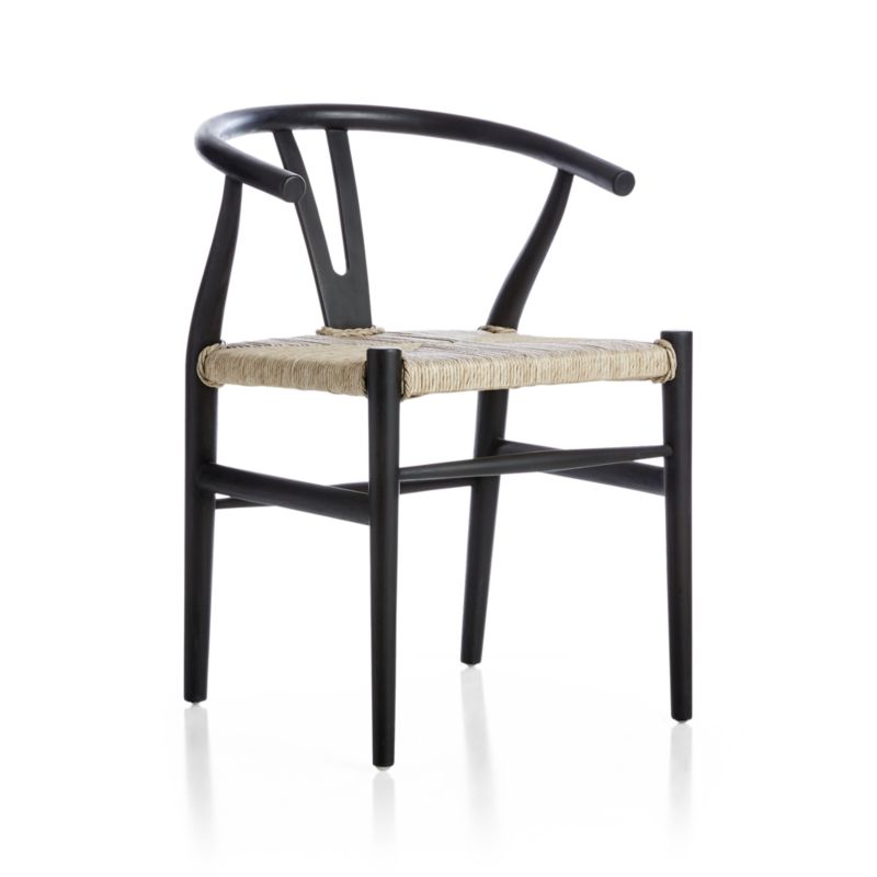 Inspired by traditional Chinese design, this modern design classic goes all natural for sophisticated dining. Fashioned with its signature Y-back and semi-circular arms, the dining chair gets a fresh dose of texture with a woven synthetic wicker seat on a frame of black-finished teak.