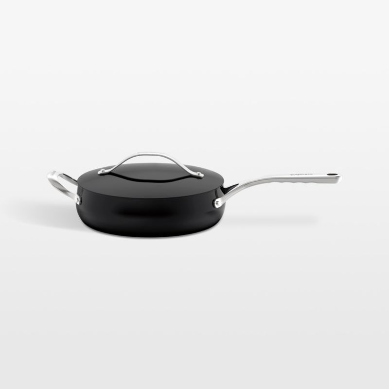 The Culinary Collection from Cuisinart boasts beautifully contoured cookware with ceramic cooking surfaces and comfortable handles. This saute pan's glossy black exterior pairs handsomely with the grey non-stick interior. Crafted of stay-cool stainless steel, the ergonomic handle sculpted with finger grips makes it easy to move the lidded pan from stovetop to oven to table.