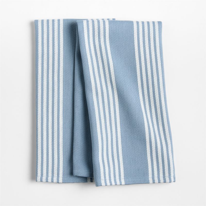 Classic bistro stripes in white on calming ocean brighten essential dish towels—a must-have for drying hands, counters and dishes or for lining bread baskets. Soft-washed for extra absorbency, these two dish towels only get softer with use and laundering. The inverse of our Cuisine stripe textiles, the towels pair perfectly with those for a coordinated kitchen.