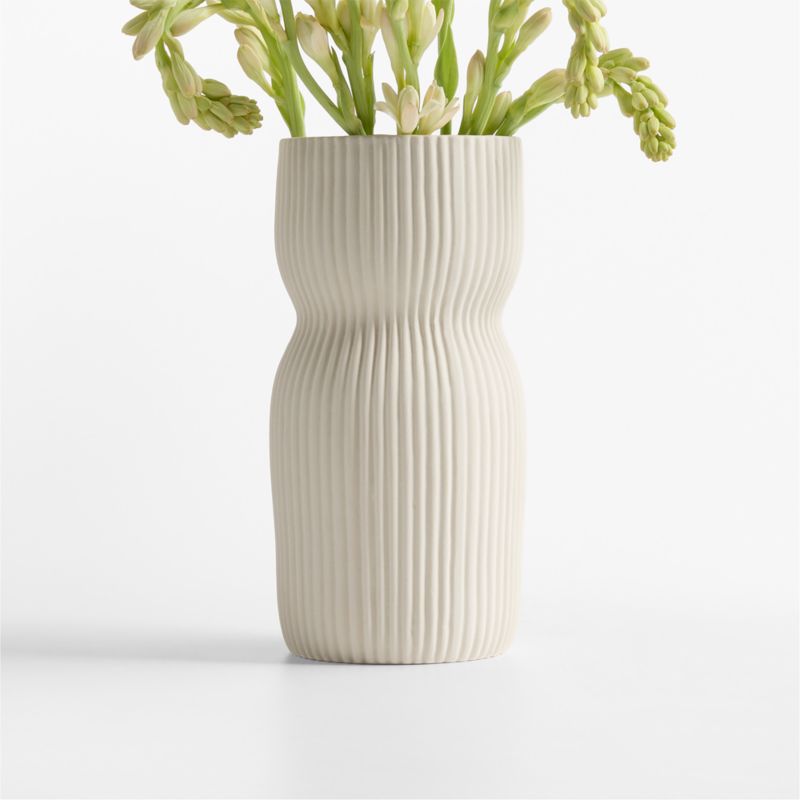 Uniquely textured and voluptuous in form, this vase was inspired by the human body. Ceramic artist Cym Warkov designed the vessel with an organic, timeless silhouette that expresses elegance in simplicity. Skilled artisans finish and glaze each earthenware vase by hand in serene cream, keeping all of the attention on the curvaceous sweep of the form-enhancing ribbing. This vase is watertight, making it ideal for filling with water to display fresh botanicals, the vase stands on its own as a work of sculpture.