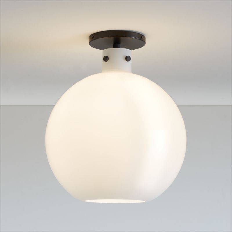 Detailed with knurling, our Dakota flush mount light balances crisp modernity with subtle industrial beauty. The result is a timeless light fixture with a straightforward presence overhead. Hand-blown by talented artisans, the large white milk glass shade shapes a bulb-like globe that contrasts softly with the black base. Our exclusive mix-and-match Dakota collection offers versatile lighting options with a custom feel.