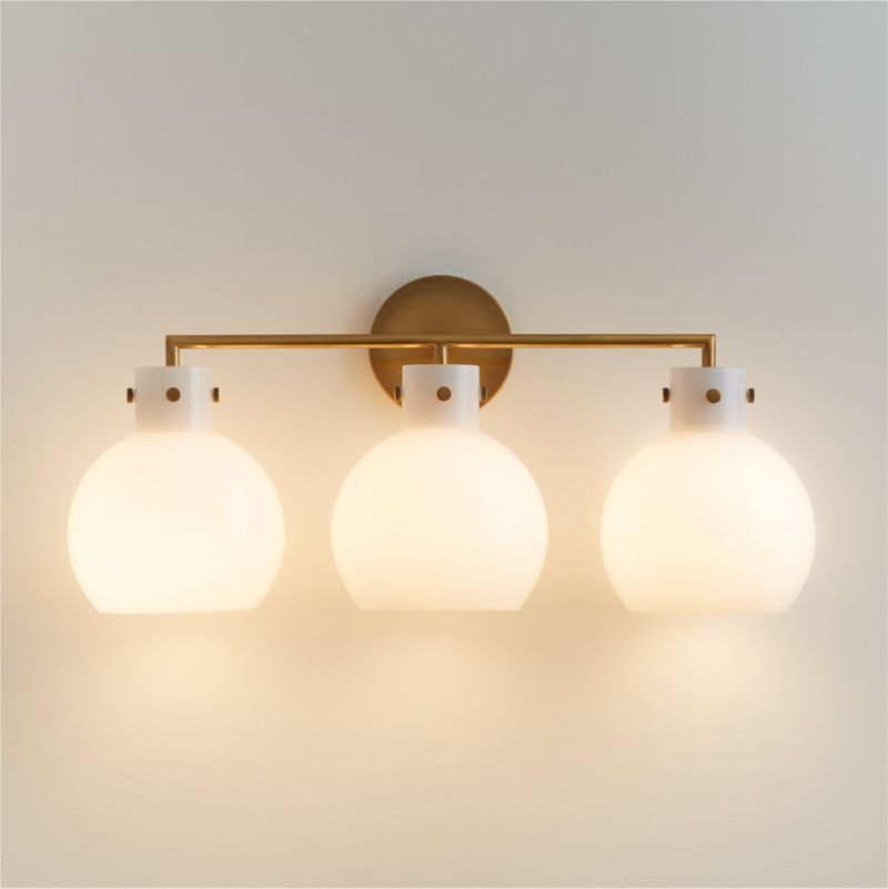 Our Dakota three-light sconce balances clean modernity with subtle industrial beauty. The result is a timeless wall light with a straightforward presence above a buffet, kitchen sink or bathroom mirror. Crafted by skilled artisans, the hand-blown milk glass shades shape bulb-like globes that contrast softly with the gleaming brass-finished fixture and knurled knobs. Our exclusive mix-and-match Dakota collection offers versatile lighting options with a custom feel.