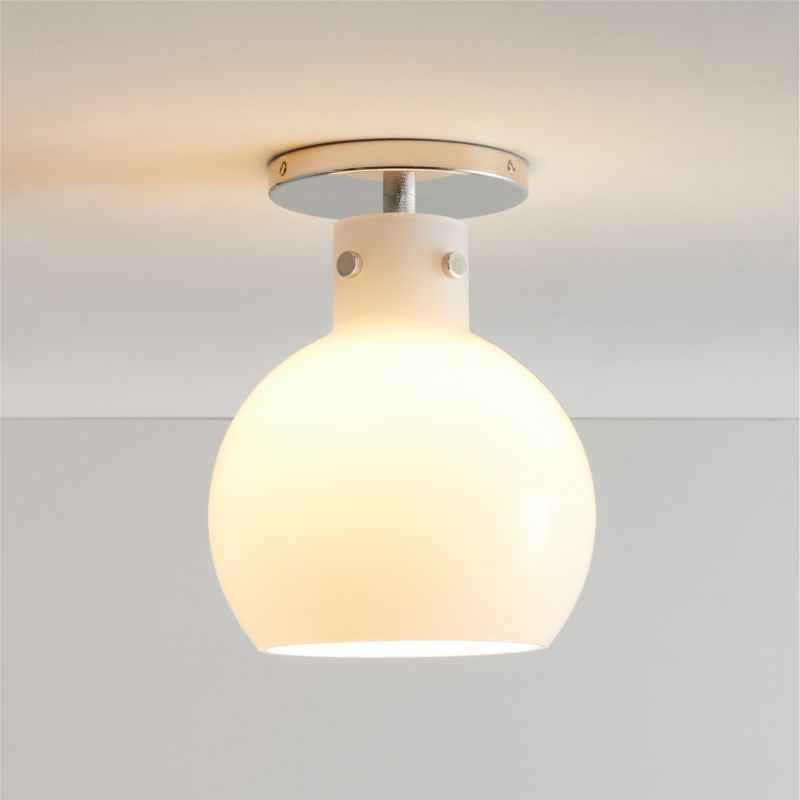 Detailed with knurling, our Dakota flush mount light balances crisp modernity with subtle industrial beauty. The result is a timeless light fixture with a straightforward presence overhead in a hallway, pantry or walk-in closet. Hand-blown by talented artisans, the small white milk glass shade shapes a bulb-like globe that pairs dreamily with the lustrous polished chrome base. Our exclusive mix-and-match Dakota collection offers versatile lighting options with a custom feel.